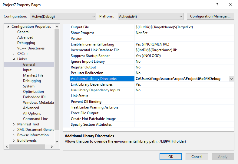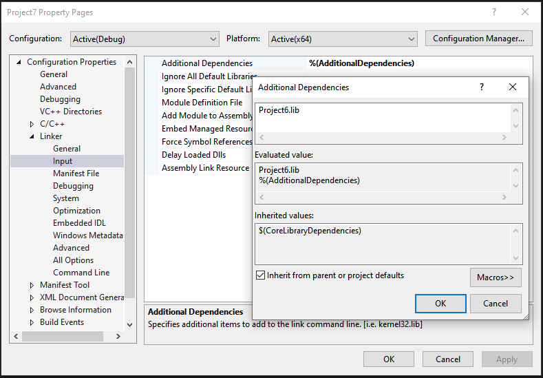 그림처럼 Additional Dependecies에서 앞서 만든 lib를 추가해줍니다.