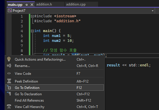 이제 위 세 개의 파일을 컴파일하고 실행하면, main.cpp 파일에서 헤더 파일 addition.h를 통해 덧셈 함수를 사용할 수 있습니다.
