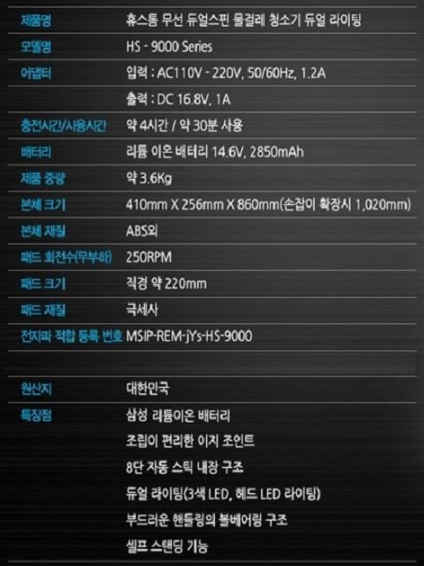 무선 물걸레 청소기 휴스톰 (HS-9000) 상세 스펙