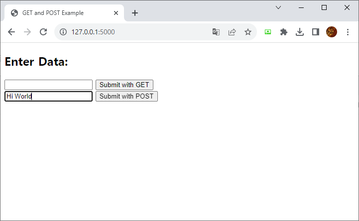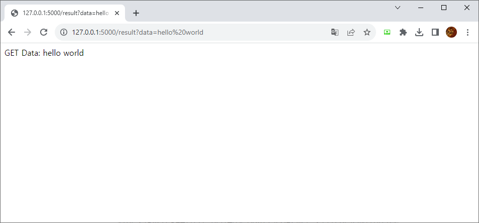 @app.route('/result', methods=['GET', 'POST']): 이 엔드포인트는 /result 경로로 GET 및 POST 요청을 처리합니다. 요청의 메서드에 따라 다르게 동작합니다. POST 요청일 경우, 폼 데이터에서 'data' 필드를 가져와 "POSTed Data: [입력 데이터]"를 반환합니다. GET 요청일 경우, URL의 쿼리 파라미터에서 'data' 값을 가져와 "GET Data: [입력 데이터]"를 반환합니다.