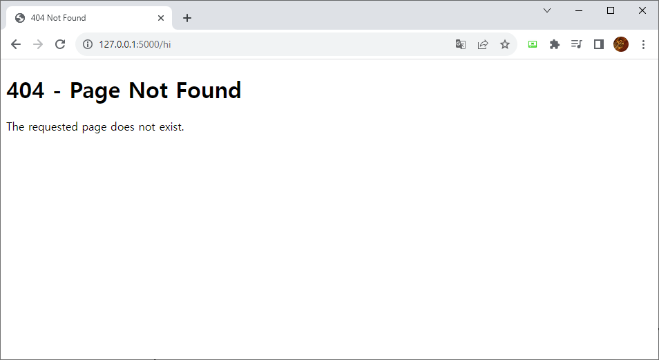 아래 예제는 flask로 백엔드 서버를 동작 시키고 없는 페이지에 접속을 하여서 404 페이지 없음 에러를 발생시키고 errorhandler에서 정상적으로 처리하는지 알아보겟습니다.
