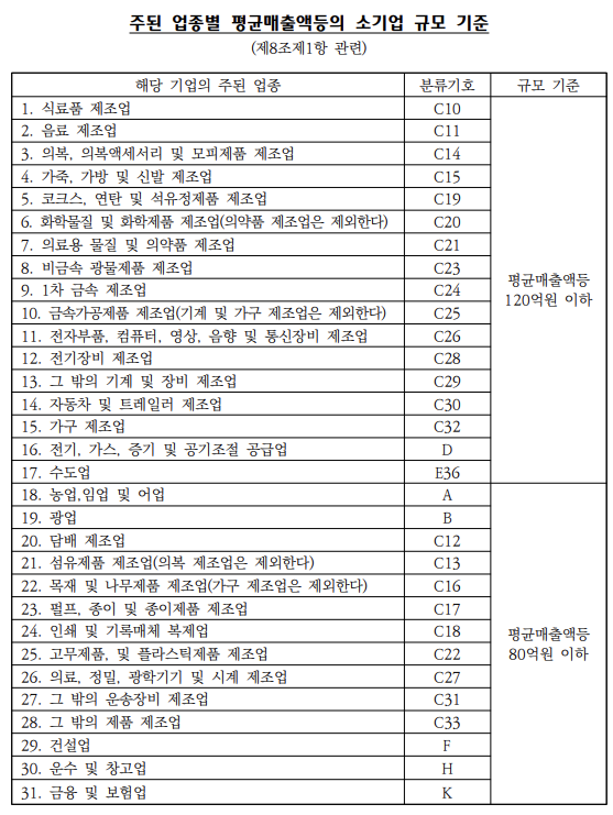 소기업은 중소기업 기본법 시행령 제 8조에 따라 아래의 별표 3의 기준으로 결정 됩니다. 해당 테이블은 업종별 평균 매출액을 기준으로 소기업을 분류 합니다.