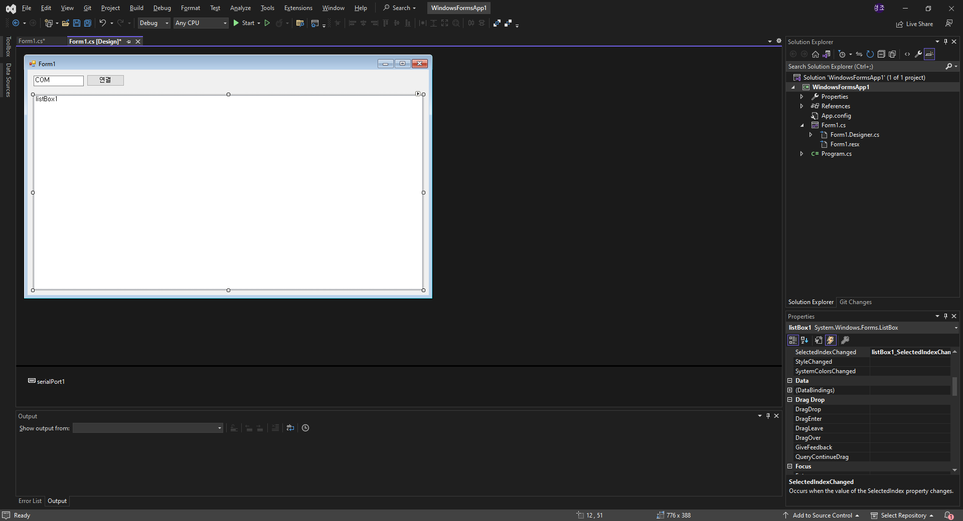 3. 아래와 같이 SerialPort를 Toolbox에서 선택하고 더블 클릭하면 해당 속성이 생기고 우측 하단과 가팅 Properties 창에서 확인이 가능 합니다.