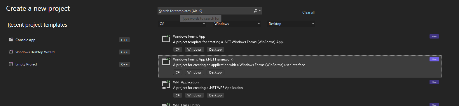 2. Visual Studio를 실행하고 New Project에서 Windows Forms App 을 아래 그림과 같이 선택합니다.