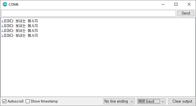 Serial.println("1초마다 보내는 메시지"); // 시리얼 모니터에 메시지 보내기