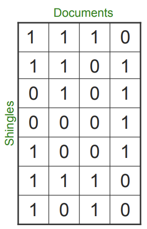 위 그림과 같이 Document와 Shingles가 정리되어있다고 가정하겠습니다. Document를 벡터 변환한 C1을 첫번째 열이고 C2는 두번째 열입니다.