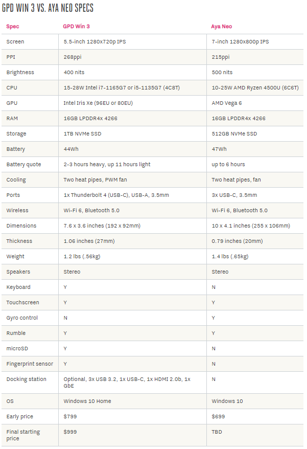 5.5인치 GPD Win3 와 7인치 Aya Neo 는 다른 방식으로 제품에 대해 접근하고 있다. Aya는 닌텐도 콘솔의 사이즈 모양, 게이밍 컨트롤 등을 비슷하게 따라가고있다. GPD는 손바닥 크기의 컴퓨터형식을 유지하고 스크린을 위로 밀어내면 키보드가 나오는 슬라이드업 스크린을 가지고 있다. 그리고 지문인식을 지원하고 microSD 슬롯과 옵션으로 Thunderbolt 4 dock을 지원한다. (윈도우10 컴퓨터처럼 사용하고 싶을 경우)